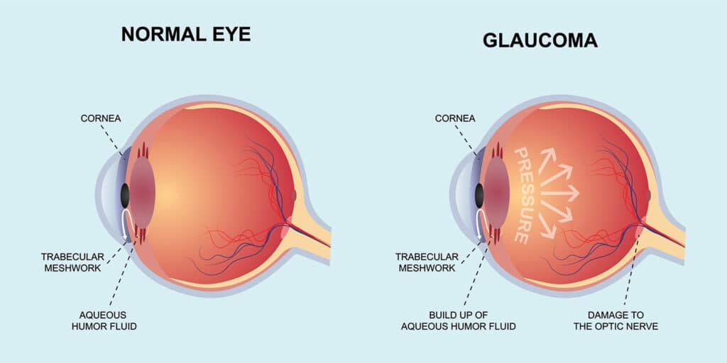 Glaucoma is actually a group of diseases that damage the optic nerve. The optic nerve is responsible for connecting the back of the eye (retina) to the brain. Glaucoma is usually caused by an increase in the fluid pressure in the eye – either because of overproduction of fluid or when the drainage system of the eye becomes blocked. The higher pressure inside the eye can cause damage to the optic nerve, resulting in permanent vision loss.